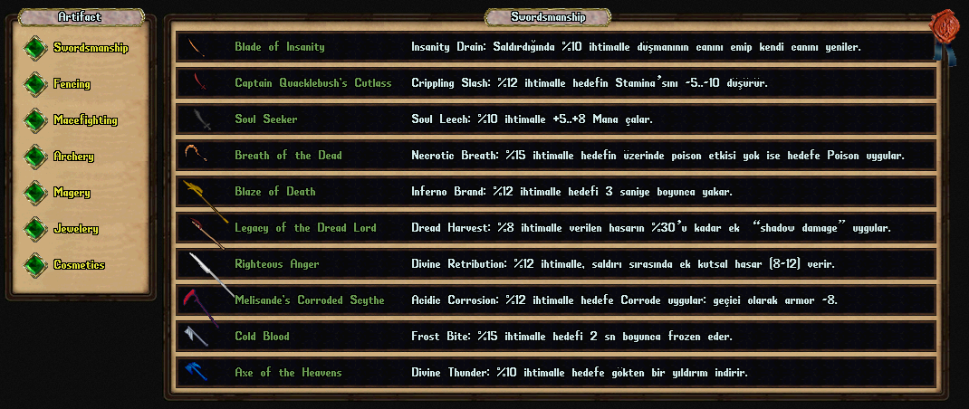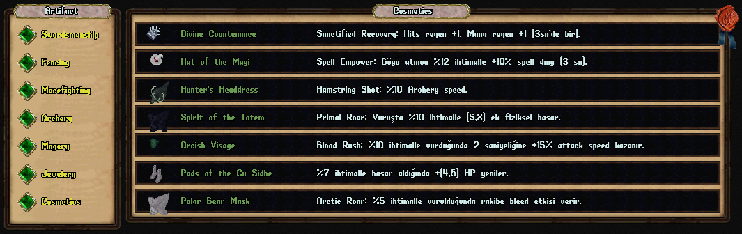 Oyun içerisinde .artifact yazarak tüm eşya ve özelliklerini görebilirsiniz.