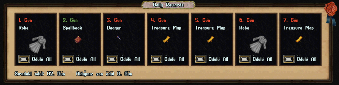 Günlük ödül sistemine erişmek için .gunlukgiris komutunu kullanarak arayüzü açabilirsiniz. Burada, mevcut gün ödülünüzü görebilir ve ödüle tıklayarak alabilirsiniz.