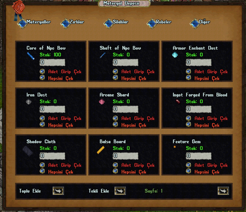 - Eşya Çekme Miktar Belirleyerek: Ürünün altındaki kutucuğa almak istediğiniz miktarı yazıp "Cek" butonuna basınız.