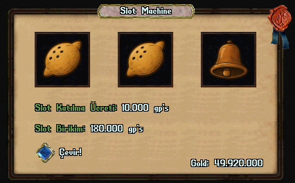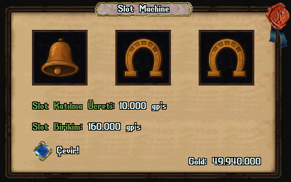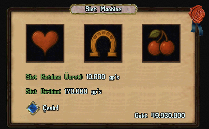 Katılım Ücreti: Slot oyununa katılmak için belirli bir miktar altın gereklidir. Bu ücret, oyundan elde edeceğiniz kazancı artırabilir. Ödüller: Üç aynı sembolü bir araya getirerek büyük ödüller kazanma şansı sunar. Kazanılan miktar, oyuncunun hesabına aktarılır. Bekleme Süresi: Oyuncular, slot oyununu oynadıktan sonra bir süre beklemek zorundadır. Bu, oyunun dengesini sağlamak için önemlidir. Oyun Mekaniği Masa Bilgisi: Slot makinesine yaklaşarak sağ tıklayın. Arkasından çeşitli bilgileri içeren bir pencere açılacaktır. Dönme İşlemi: "Çevir!" butonuna basarak sembollerin dönmesini sağlayabilirsiniz. Sonuçları Görüntüleme: Dönme işlemi tamamlandığında, kazandığınız miktar veya kaybettiğiniz tutar size iletilecektir.
